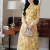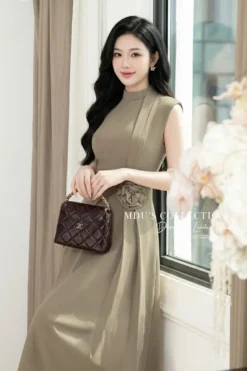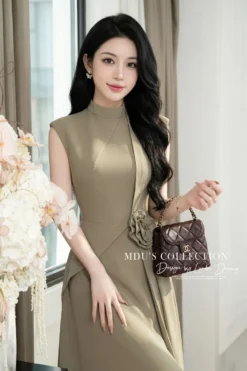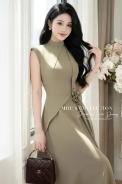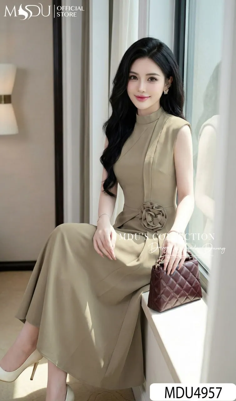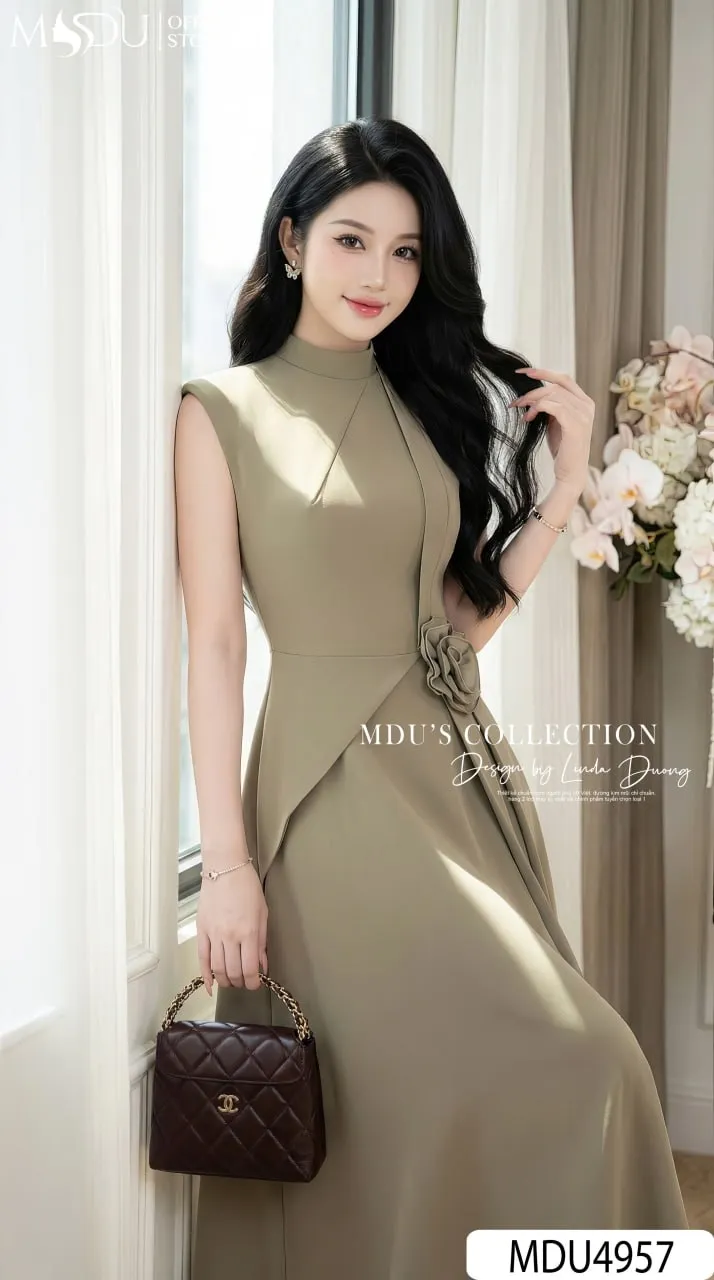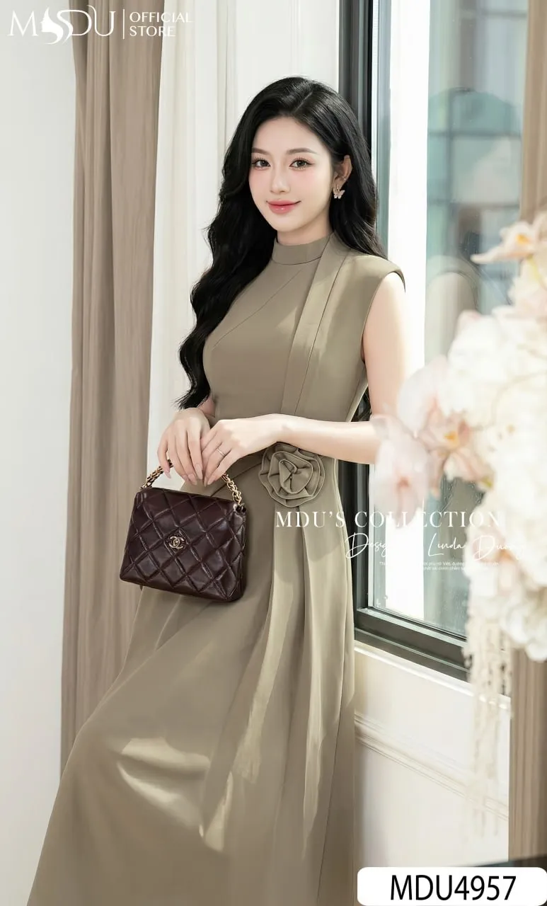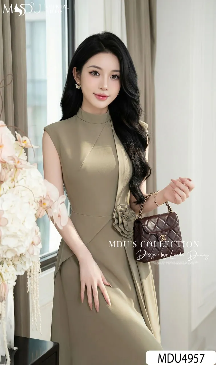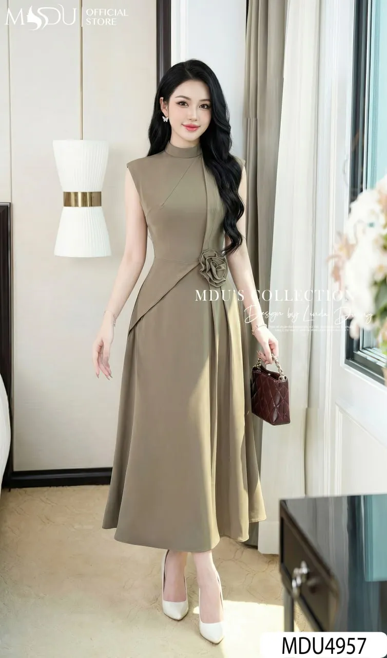 Shop the MDU4957 Elegant Japanese Twill Midi. Featuring a flared silhouette, sophisticated mandarin collar, handmade floral waist detail, and premium Habutai lining.