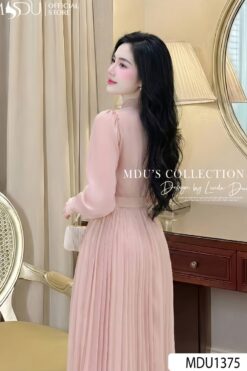 The MDU1375 is a luxurious statement piece defined by its shimmering imported silk and artisanal pleating. With its sophisticated high collar and skin-safe construction, it is a highly versatile dress perfect for the office, formal parties, or elegant outings.