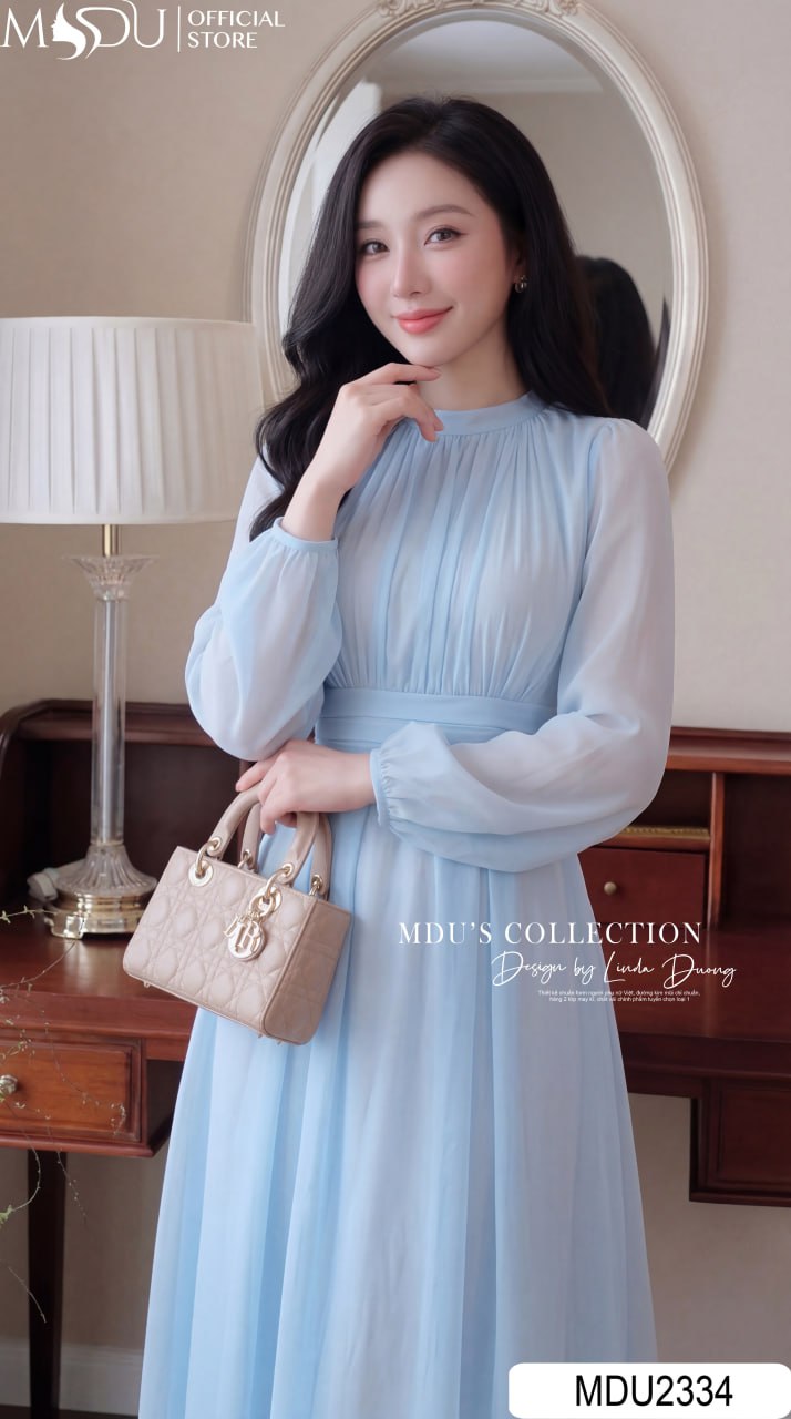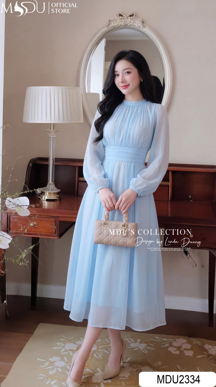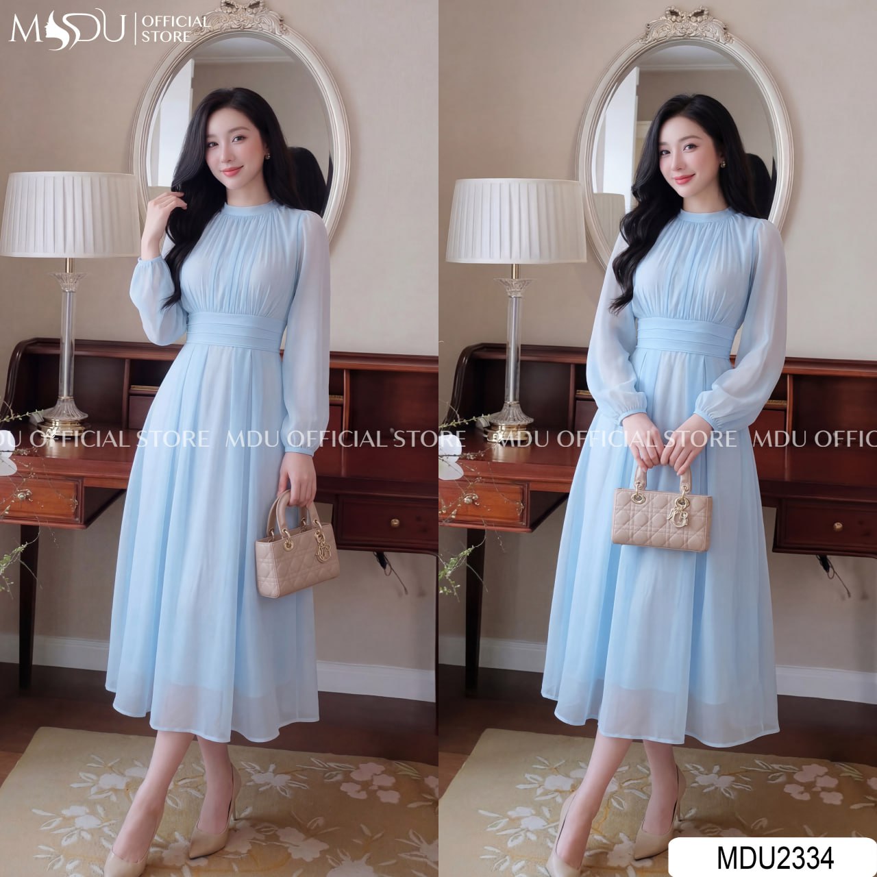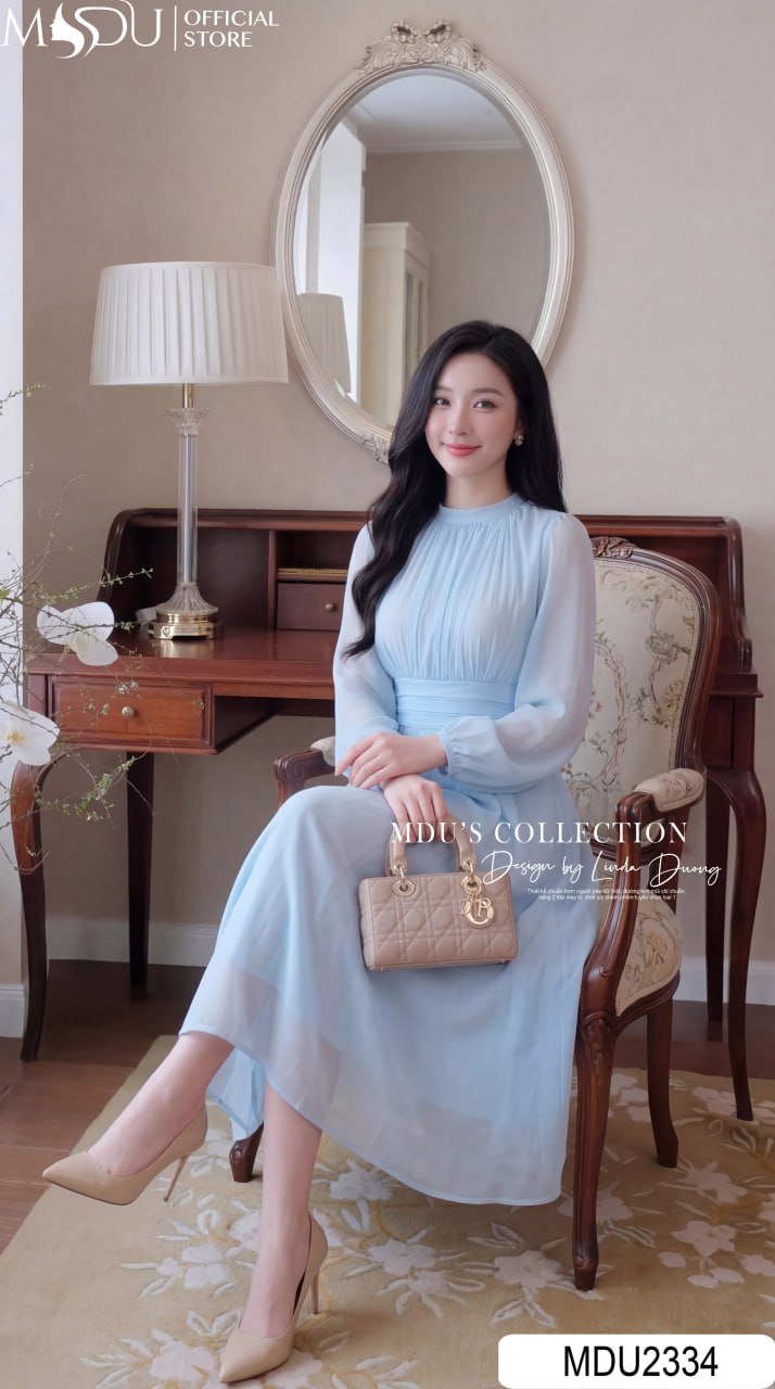 The MDU2334 is a luxe silk statement piece defined by its airy Korean silk and flattering flared silhouette. With its sophisticated sheer sleeves and waist-defining cut, it is the ideal choice for tea parties, romantic dates, or high-end outdoor events.