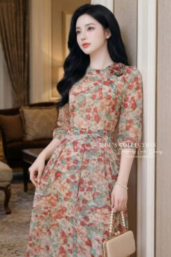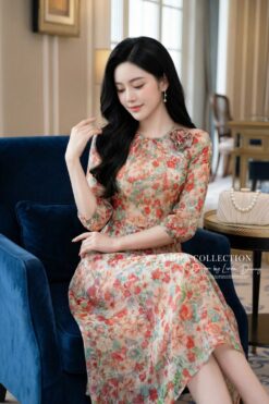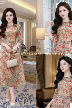 Silhouette: A classic A-line flared silhouette (dáng dài xòe nhẹ) that cinches at the natural waist to accentuate the figure while offering a flowing, comfortable skirt that hits at a sophisticated midi length.