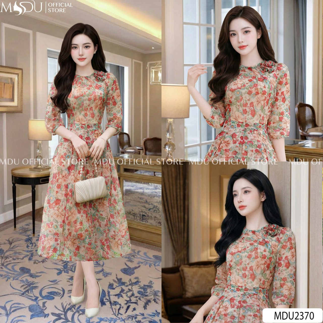 Shop the MDU2370 Premium Slub Silk Midi Dress. Featuring a vibrant floral print, Habutai silk lining, and an elegant 3D shoulder flower for a sophisticated, feminine look.