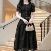 Make an unforgettable impression in the MDU4682. This premium black lace dress harmonizes soft, high-quality fabric with a stunning pearl-accented collar and a flowing maxi cut, offering the perfect balance of modern class and romantic allure.