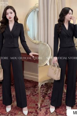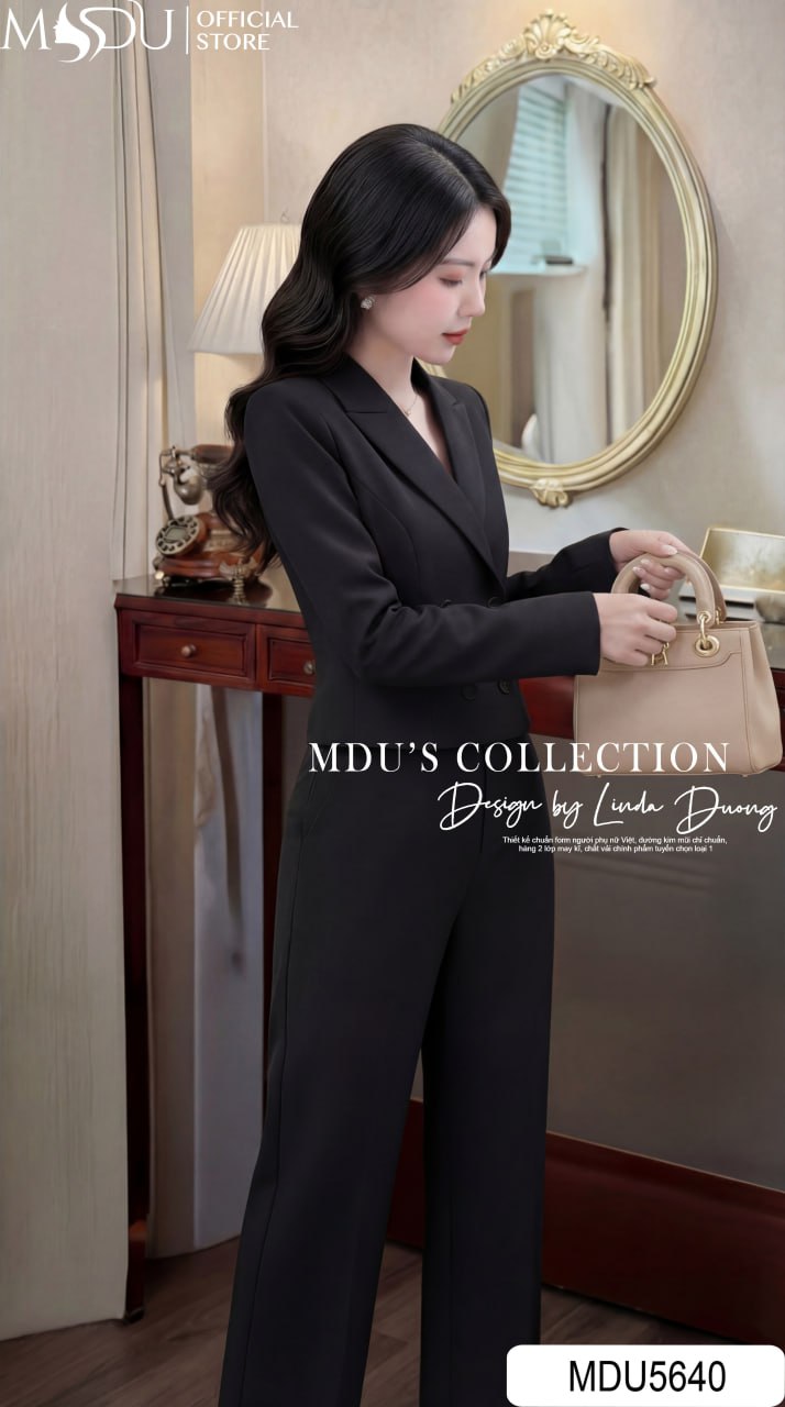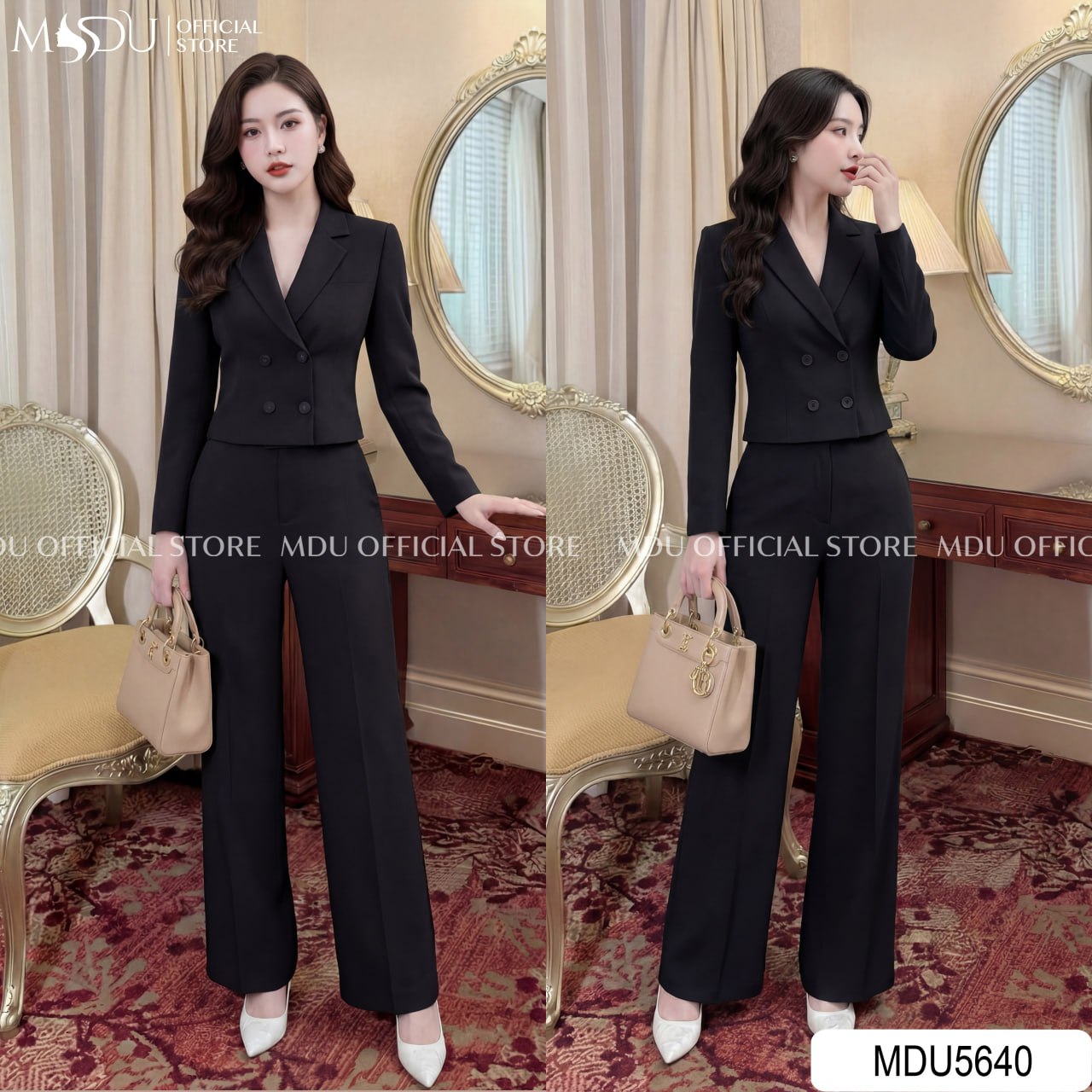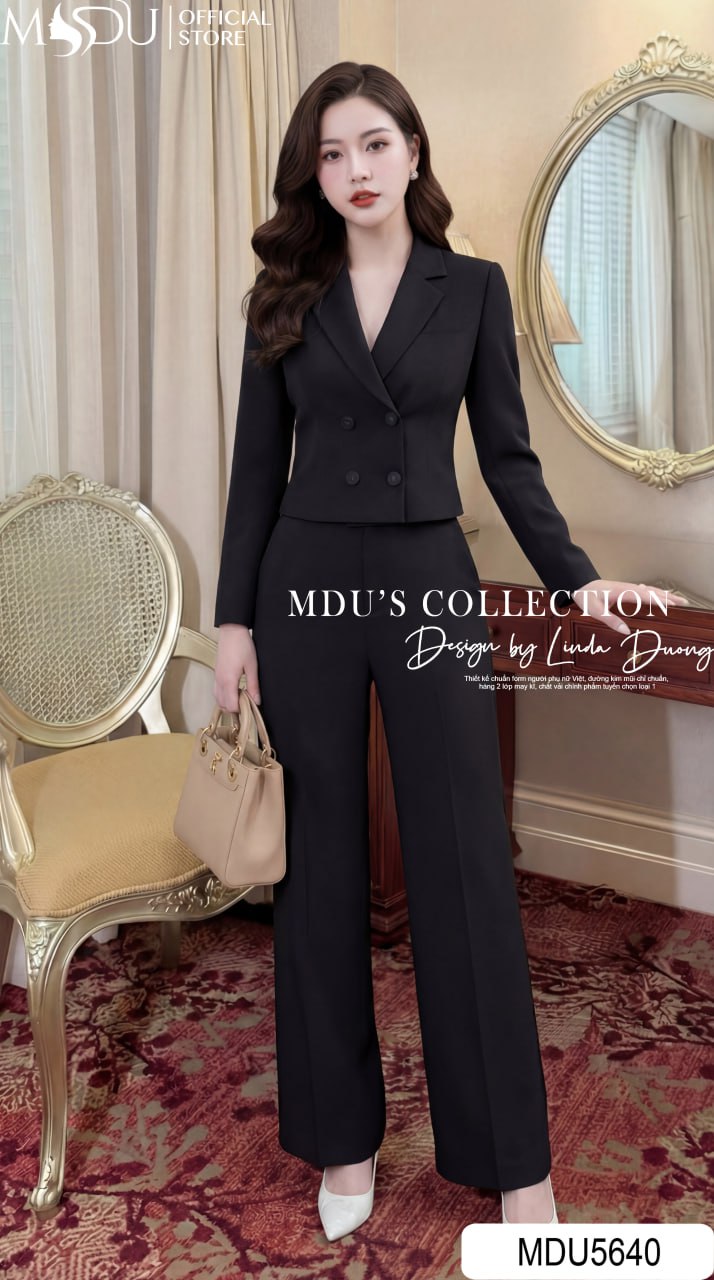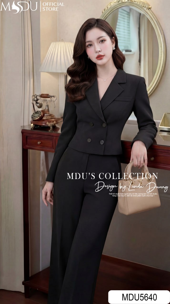 The MDU5640 set is meticulously crafted from Premium Italian Mango Silk (Chất Mango Ý cao cấp), a textile prized for its high-density weave that maintains a sharp, professional structure while remaining smooth to the touch. This fabric provides a refined drape that contours the body without losing its crisp lines. The blazer is double-layered (may 2 lớp) for added weight and luxury, while the trousers are designed as a single-layer (1 lớp) for maximum breathability and effortless movement throughout a busy workday.