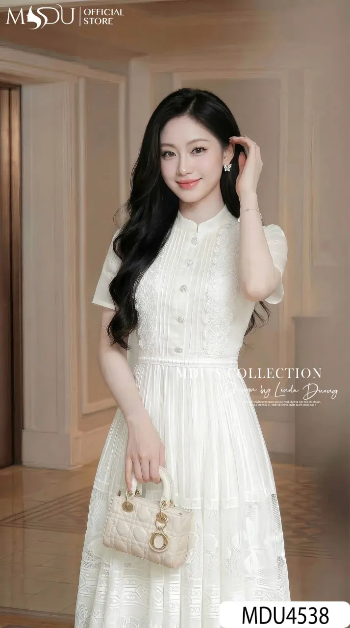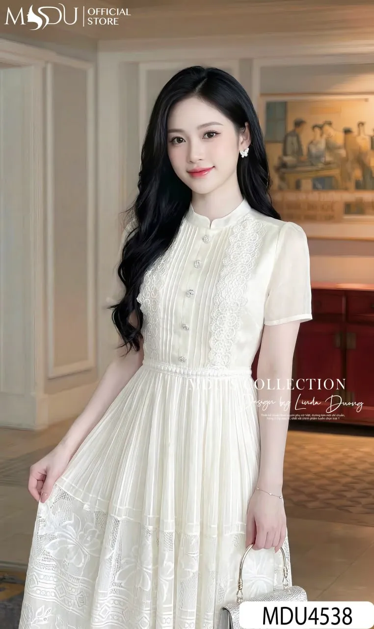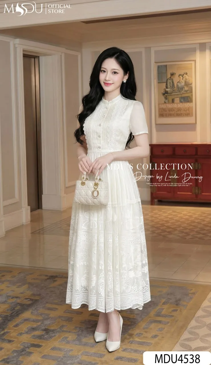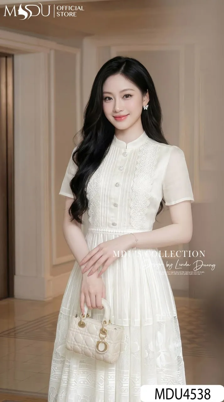 Redefine classic femininity with the MDU4538. This luxury lace-paneled dress combines the intricate beauty of corded lace with the soft touch of Korean Tơ. With its elegant high collar, puff sleeves, and signature vertical lace accents, it offers a statuesque and polished look that is perfect for any high-profile setting.