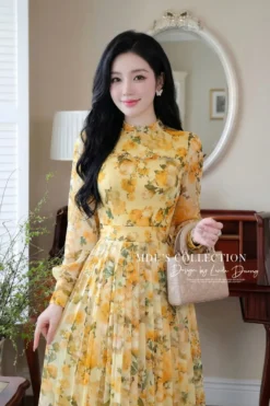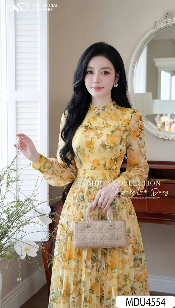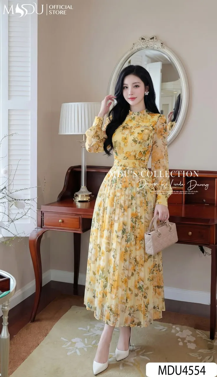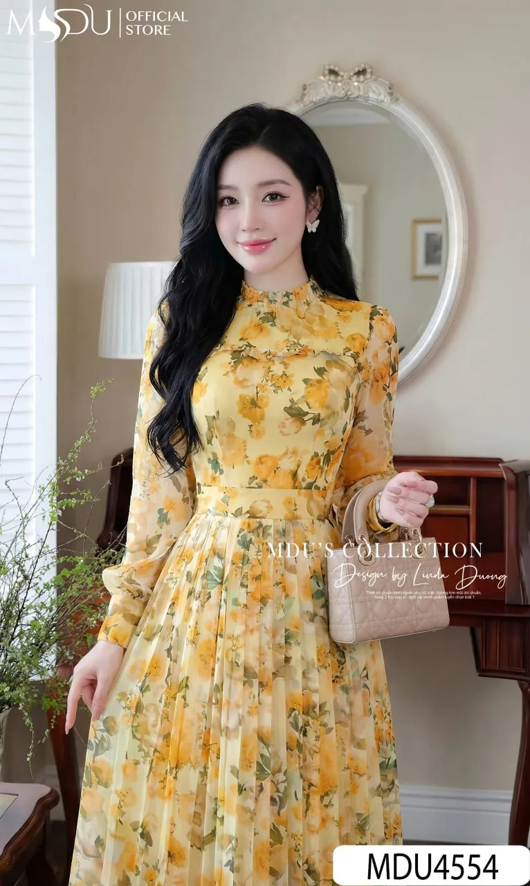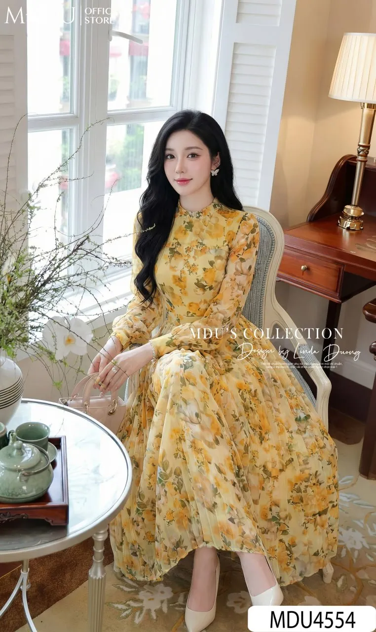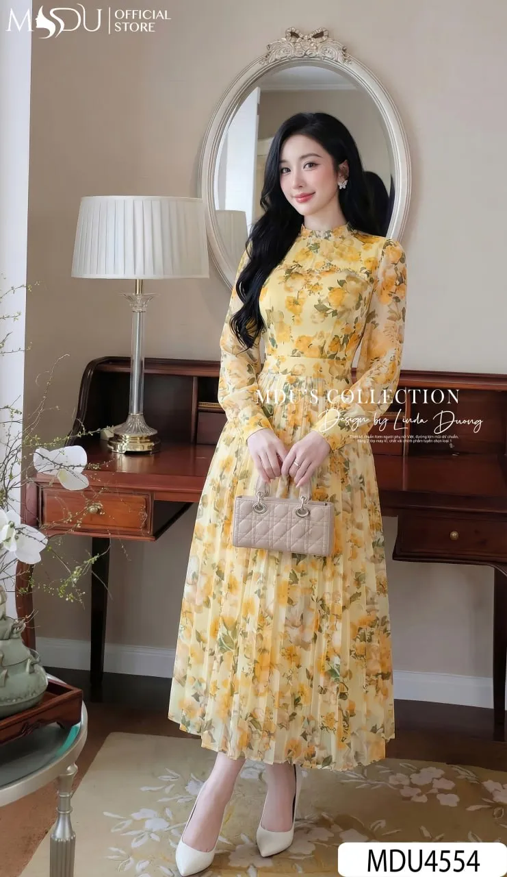 Embrace effortless elegance with the MDU4554. This premium Korean silk maxi dress features a stunning yellow floral print and a double-layered design for ultimate comfort. With its pleated neckline and flowing long-sleeve silhouette, it perfectly blends vintage charm with modern sophistication.
